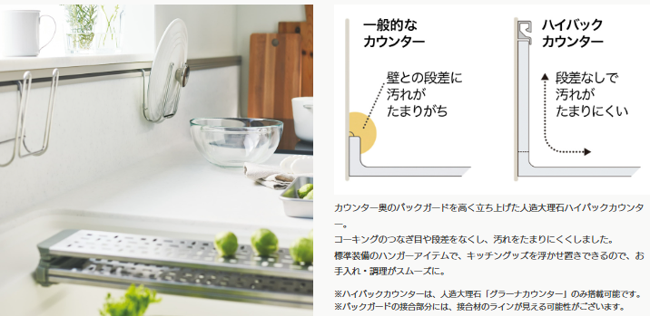 - カウンター奥のバックガードを高く立ち上げた人造大理石ハイバックカウンター。
