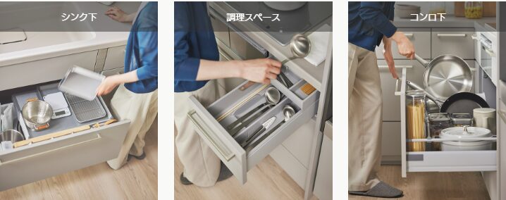 シンク下のスペースは連動イン引出し「ステップドロワー」が設置されており、使用頻度や高さの違いなどに応じてゾーン分けした収納が可能です。またコンロ下のスペースは持ち手がかさばるフライパンなどを立てて収納できるようになっています。位置も調整することが可能なので、持っている調理器具に合わせられるのも嬉しいポイントです。